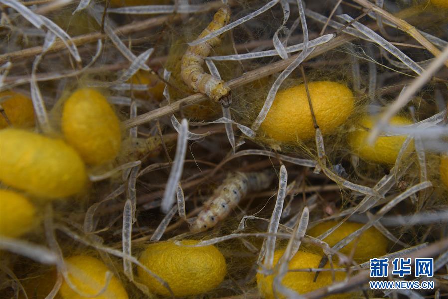養(yǎng)殖的黃金蠶在吐絲結(jié)繭(5月27日攝)。新華社記者徐昱攝