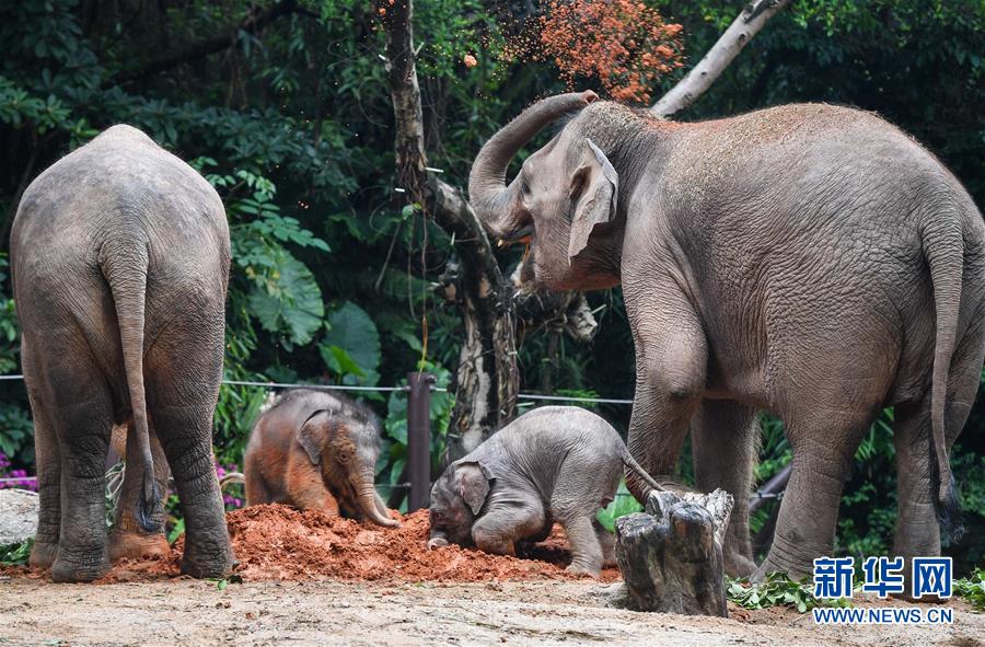 5月27日,廣州長(zhǎng)隆亞洲象媽媽卷起紅泥撒在身上,這些泥土可以幫助大象護(hù)理皮膚和補(bǔ)充鹽分。新華社記者劉大偉攝