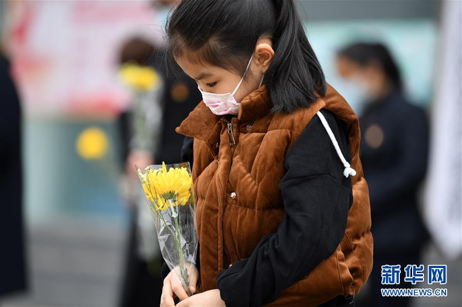 安徽肥西,一名小女孩在哀悼活動(dòng)上默哀(4月4日攝)。新華社記者劉軍喜攝