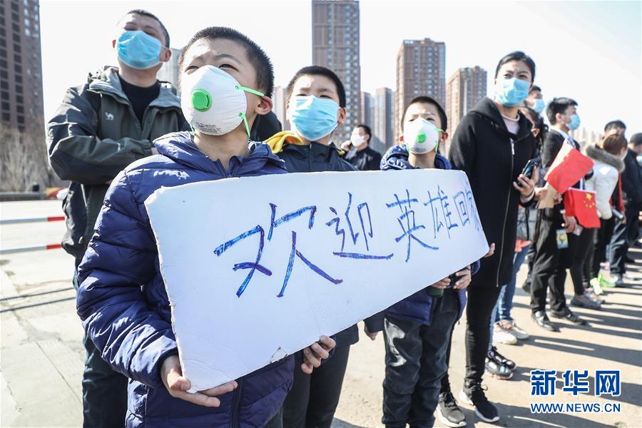 遼寧沈陽一高速公路出口,男孩們列隊(duì)歡迎遼寧對(duì)口支援襄陽醫(yī)療隊(duì)歸來(3月21日攝)。新華社記者潘昱龍攝
