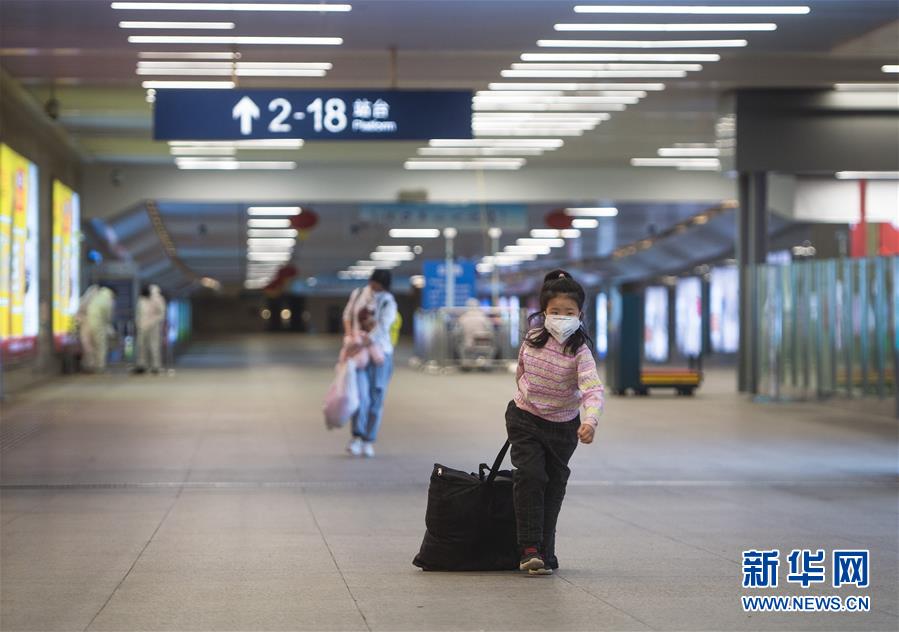 武漢恢復(fù)鐵路客站到達(dá)業(yè)務(wù)當(dāng)天,在武漢漢口火車站,一名小女孩拉著行李走在家長(zhǎng)的前面(3月28日攝)。新華社記者肖藝九攝