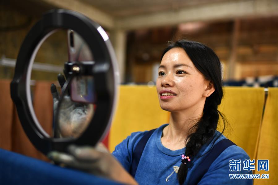 楊成蘭在用手機(jī)對侗族土布植物染色技藝進(jìn)行網(wǎng)絡(luò)直播(5月28日攝)。