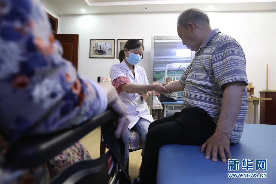 6月1日,在正定縣塔元莊村勁松老年公寓,醫(yī)護人員為老人做康復按摩。新華社記者朱旭東攝。