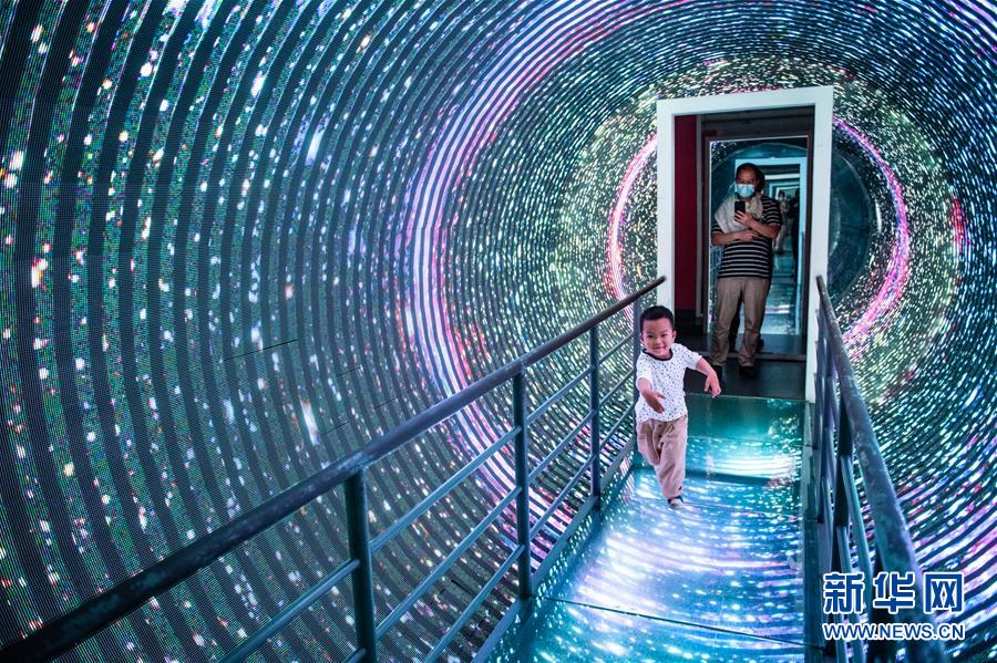 6月1日,小朋友在貴州科技館內體驗“時光隧道”。