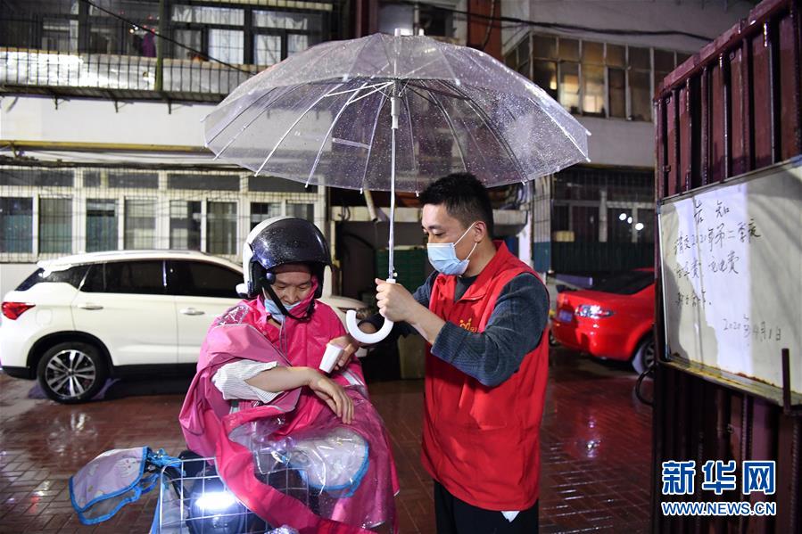 楊龍明在小區(qū)內給住戶檢測體溫(6月1日攝)。新華社記者李然攝。