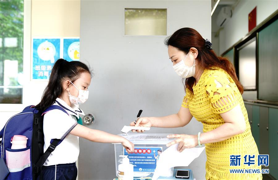 6月2日,上海閔行區(qū)鑫都小學(xué),老師為一名一年級小學(xué)生量體溫。當(dāng)日,上海小學(xué)一、二、三年級學(xué)生返校開學(xué)。新華社記者張建松攝。