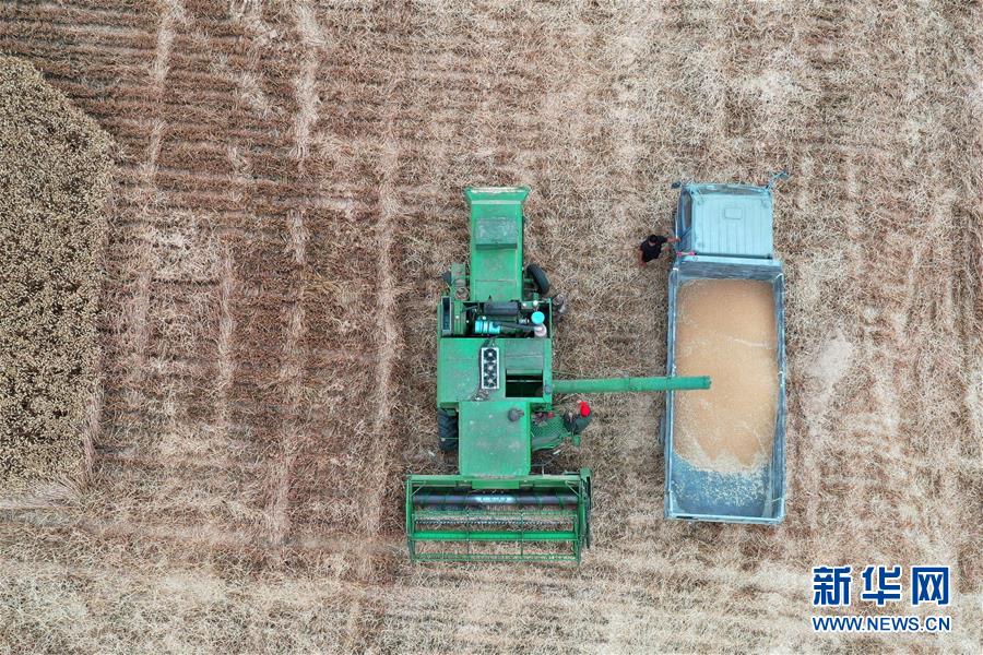 6月2日,在河南省黃泛區(qū)農(nóng)場九分場的麥田里,農(nóng)民操作大型收割機收獲小麥(無人機照片)。新華社記者馮大鵬攝。