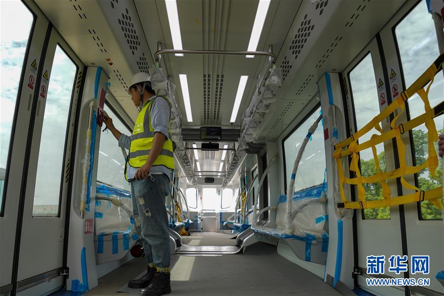 6月3日,工程技術(shù)人員在“云巴”車廂內(nèi)對(duì)安裝的電氣設(shè)備進(jìn)行調(diào)試。近日,重慶市首條“云巴”示范線項(xiàng)目在重慶璧山區(qū)正式亮相。此次發(fā)布的“云巴”采用電能驅(qū)動(dòng),具有轉(zhuǎn)彎半徑小、爬坡能力強(qiáng)、噪音低、安全性高、建設(shè)成本低、建造周期短等優(yōu)勢(shì),能為乘客提供更智能、舒適、便捷的出行體驗(yàn)。據(jù)介紹,璧山區(qū)“云巴”示范線項(xiàng)目自2019年8月開建,線路正線全長15.4km,共設(shè)車站15座,預(yù)計(jì)2020年9月全線通車。新華社記者劉潺攝。