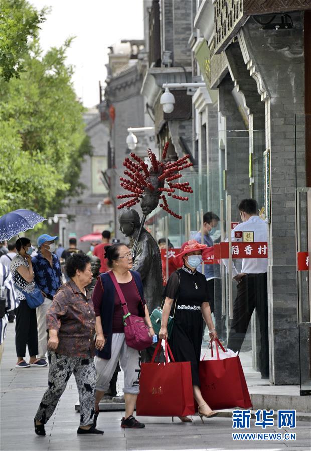 6月3日,市民及游客在前門(mén)步行街購(gòu)物觀(guān)光。近日,游人和市民紛紛來(lái)到北京市的王府井、西單、前門(mén)大街等著名商業(yè)街購(gòu)物休閑,這些老商業(yè)街開(kāi)始逐步恢復(fù)昔日的繁華。新華社記者李欣攝。