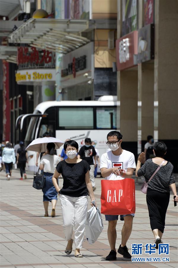 6月3日,市民及游客在王府井步行街購(gòu)物。近日,游人和市民紛紛來到北京市的王府井、西單、前門大街等著名商業(yè)街購(gòu)物休閑,這些老商業(yè)街開始逐步恢復(fù)昔日的繁華。新華社記者李欣攝。