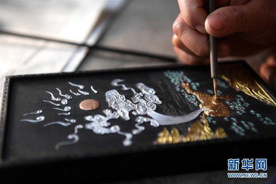 5月20日,安徽歙縣“項(xiàng)氏徽墨”的工人為晾干的墨進(jìn)行描金。新華社記者劉軍喜攝。