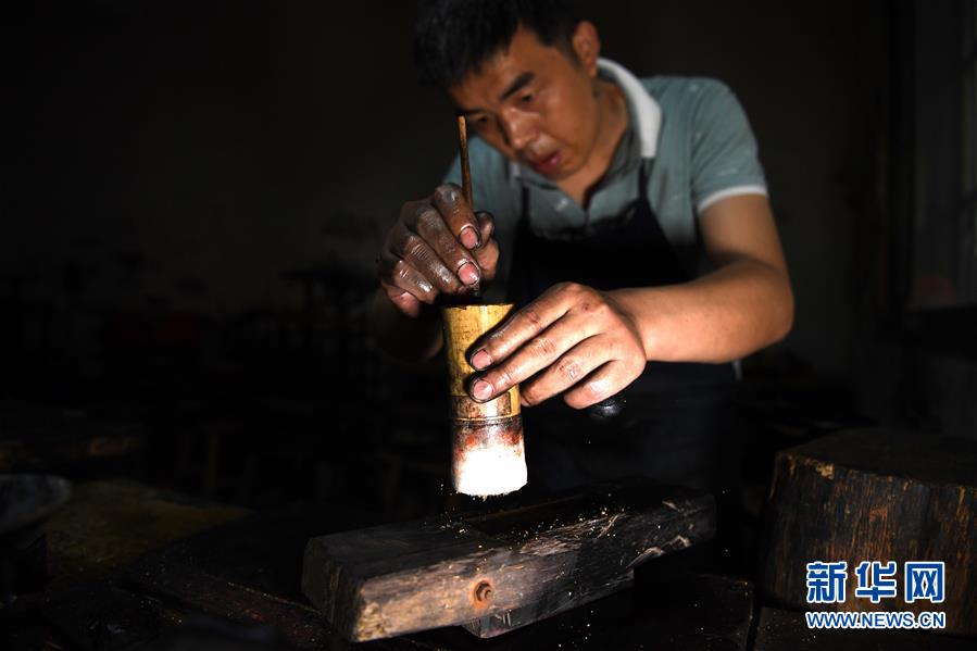 5月21日,安徽歙縣“項氏徽墨”的工人在捶打墨胚。新華社記者張端攝。