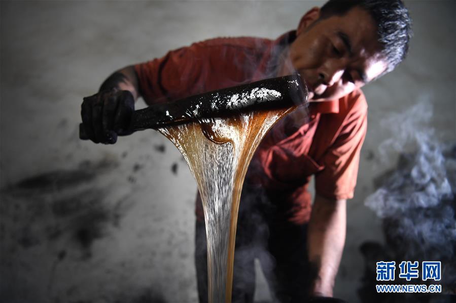 5月20日,安徽歙縣“項(xiàng)氏徽墨”的工人在熬膠。熬好的骨膠和煙灰混合后制作成墨泥。新華社記者劉軍喜攝。