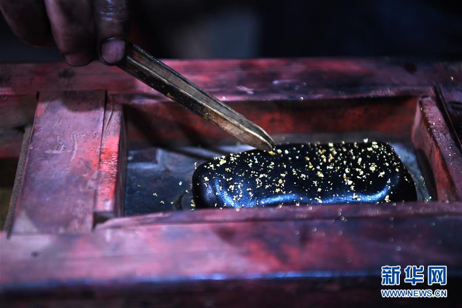 5月21日,安徽歙縣“項(xiàng)氏徽墨”的工人在墨胚上灑金。新華社記者張端攝。