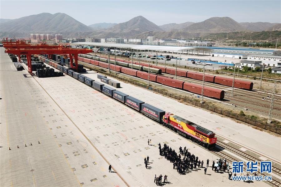 6月5日,在甘肅蘭州國(guó)際陸港,“中吉烏”公鐵聯(lián)運(yùn)國(guó)際貨運(yùn)班列準(zhǔn)備發(fā)車(chē)(無(wú)人機(jī)照片)。新華社記者范培珅攝。