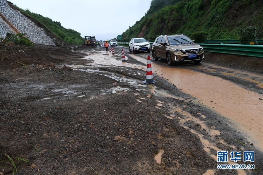 6月7日,在廣西鹿寨至陽(yáng)朔的高速公路上,車輛從一處發(fā)生滑坡的路段經(jīng)過。新華社記者陸波岸攝