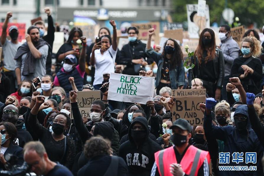6月7日,民眾在比利時布魯塞爾市中心的司法宮附近參加示威活動。比利時民眾當(dāng)日在布魯塞爾市中心的司法宮附近舉行示威活動,抗議美國明尼阿波利斯市警察暴力執(zhí)法致非裔男子喬治·弗洛伊德死亡。新華社記者鄭煥松攝