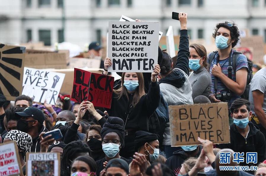 6月7日,民眾在比利時布魯塞爾市中心的司法宮附近參加示威活動。比利時民眾當(dāng)日在布魯塞爾市中心的司法宮附近舉行示威活動,抗議美國明尼阿波利斯市警察暴力執(zhí)法致非裔男子喬治·弗洛伊德死亡。新華社記者鄭煥松攝