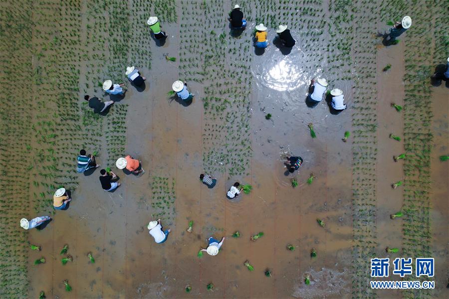 6月7日,孩子和家長們在體驗稻田插秧(無人機(jī)照片)。新華社記者徐昱攝
