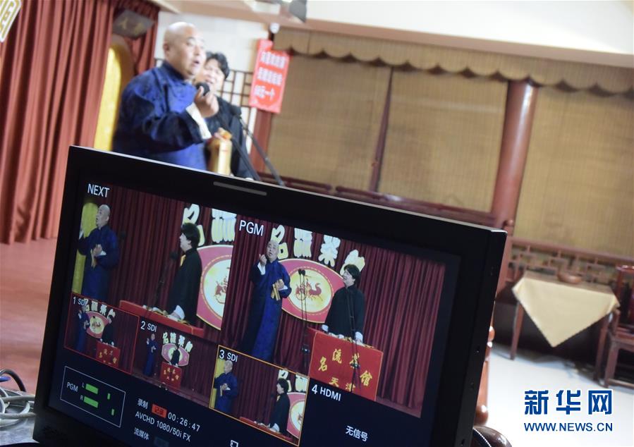 6月6日晚,天津名流茶館的相聲演員在付費(fèi)直播《名流名家“逗你玩”》演出中說(shuō)相聲。隨著疫情防控形勢(shì)逐漸向好,天津的一些茶館紛紛轉(zhuǎn)戰(zhàn)“云端”說(shuō)相聲,推出付費(fèi)直播演出,并邀請(qǐng)一些幸運(yùn)觀(guān)眾到現(xiàn)場(chǎng)觀(guān)看,在傳播津味相聲、培養(yǎng)年輕觀(guān)眾的同時(shí),也為即將到來(lái)的線(xiàn)下演出“預(yù)熱”。新華社記者周潤(rùn)健攝