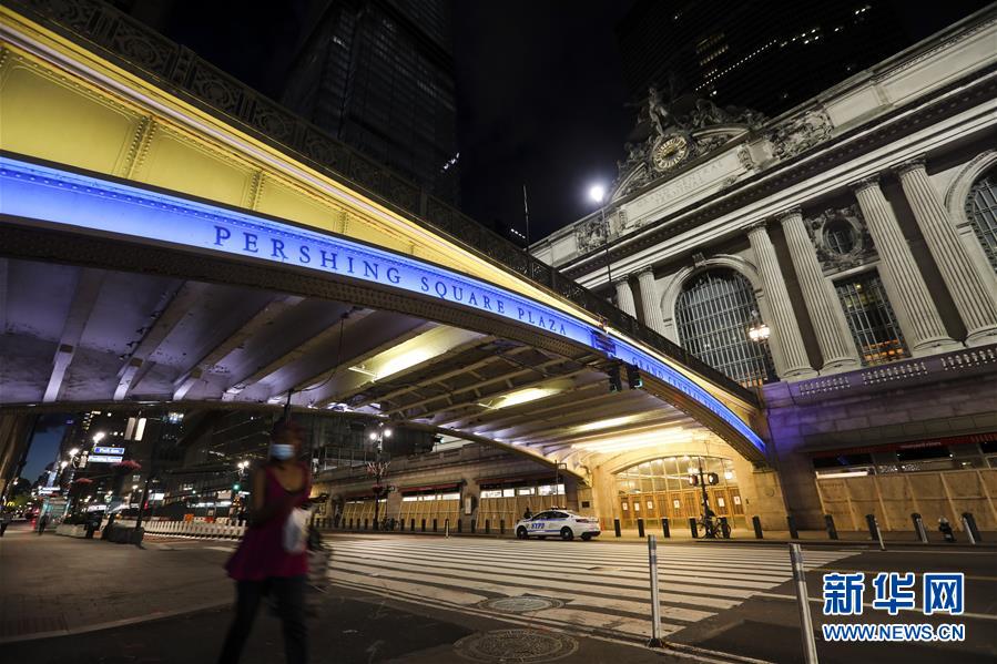 6月7日,美國(guó)紐約中央車站天橋點(diǎn)亮藍(lán)色和金色燈光。新華社記者王迎攝