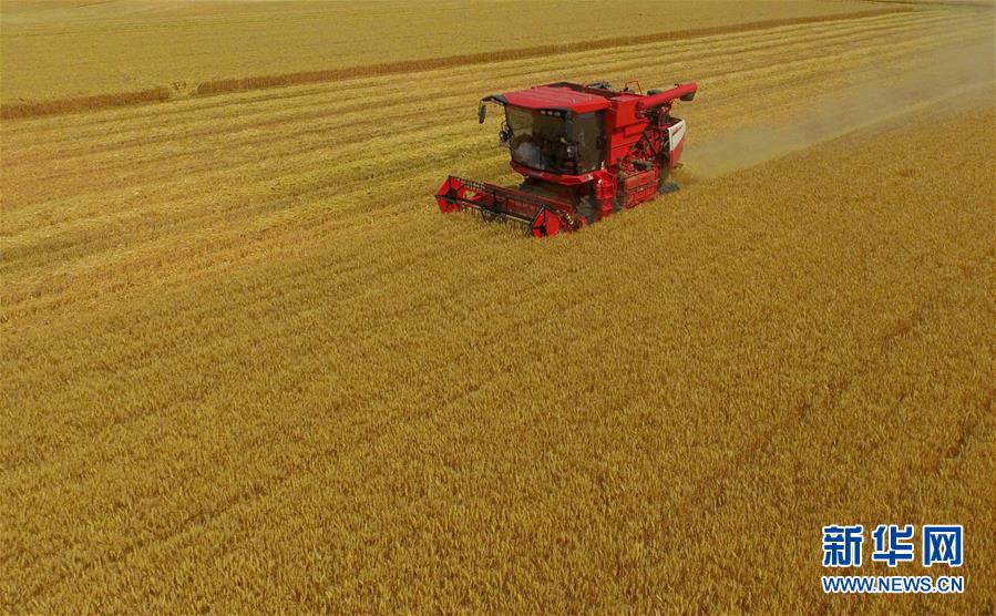 6月8日,聯(lián)合收割機(jī)在河北省南和縣閆里鄉(xiāng)閆里村麥田進(jìn)行夏收作業(yè)(無人機(jī)照片)?!叭摹逼陂g,河北省預(yù)計組織和調(diào)度小麥聯(lián)合收割機(jī)、拖拉機(jī)、夏玉米播種機(jī)等200萬臺農(nóng)業(yè)機(jī)械投入作業(yè)。新華社記者朱旭東攝