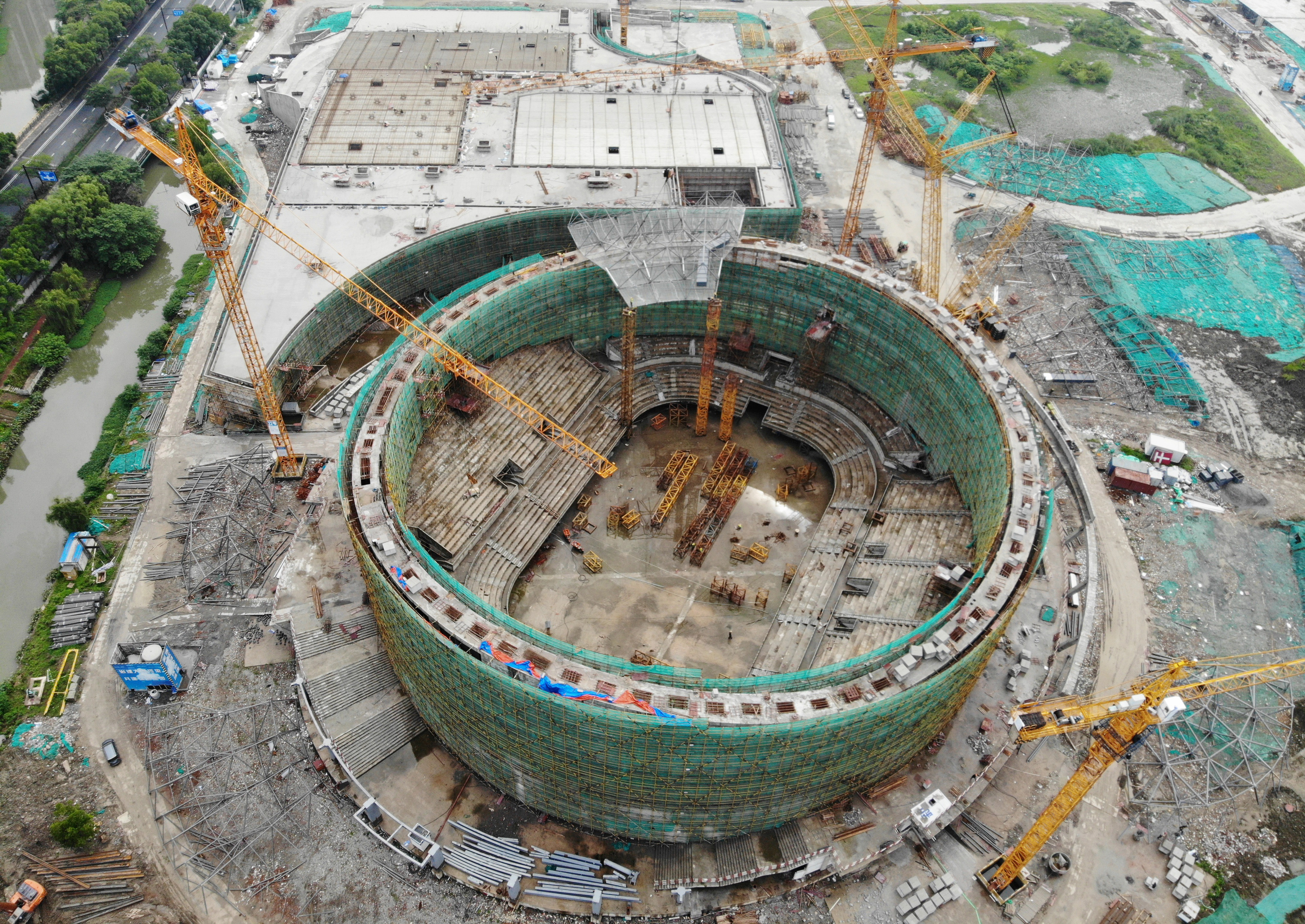 2020年6月9日,從空中俯瞰正在建設(shè)中的杭州亞運(yùn)會(huì)乒乓球館。近日,位于杭州運(yùn)河亞運(yùn)公園內(nèi)的乒乓球館主體結(jié)構(gòu)完工,開(kāi)始進(jìn)入自支撐鋼斜肋系統(tǒng)玻璃立面安裝階段。據(jù)了解,杭州亞運(yùn)會(huì)乒乓球館占地1.94萬(wàn)平方米,將建成12片標(biāo)準(zhǔn)乒乓球場(chǎng)地,并可容納5000-6500位觀(guān)眾。該乒乓球館設(shè)計(jì)靈感來(lái)源于杭州良渚文化中的“玉文化”,采用了“琮”的樣子。