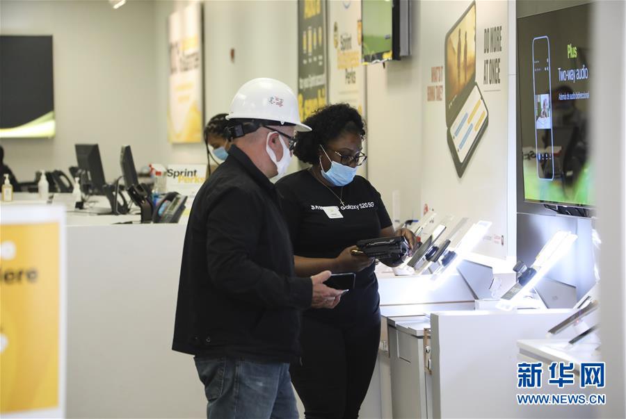 6月8日,店員(右)在美國紐約一家電信運(yùn)營商營業(yè)廳內(nèi)為顧客服務(wù)。在因新冠疫情進(jìn)入“居家令”近三個月之后,美國紐約市于當(dāng)?shù)貢r間8日開始“解封”,進(jìn)入經(jīng)濟(jì)重啟的第一階段。新華社記者王迎攝