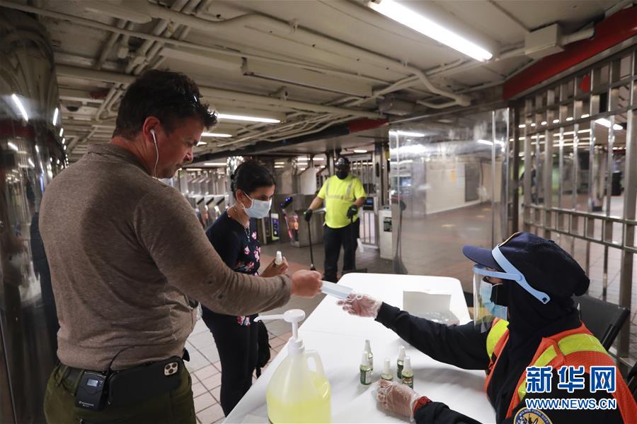 6月8日,在美國紐約,地鐵工作人員為乘客發(fā)放洗手液和口罩。在因新冠疫情進(jìn)入“居家令”近三個(gè)月之后,美國紐約市于當(dāng)?shù)貢r(shí)間8日開始“解封”,進(jìn)入經(jīng)濟(jì)重啟的第一階段。新華社記者王迎攝