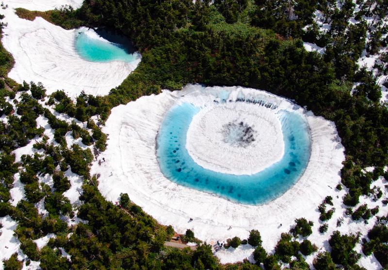 當(dāng)?shù)貢r(shí)間2020年6月8日,日本,在橫跨巖手縣與秋田縣的八幡平山頂附近的“鏡沼”,伴隨著“鏡沼”的積雪從外側(cè)逐漸融化,外圍的碧藍(lán)色湖水與中心部的潔白積雪相映成趣,呈現(xiàn)出獨(dú)特的類(lèi)似“龍眼”的景象。據(jù)悉,八幡平“龍眼”奇景只在每年5月下旬至6月初的雪融期間短暫出現(xiàn)。