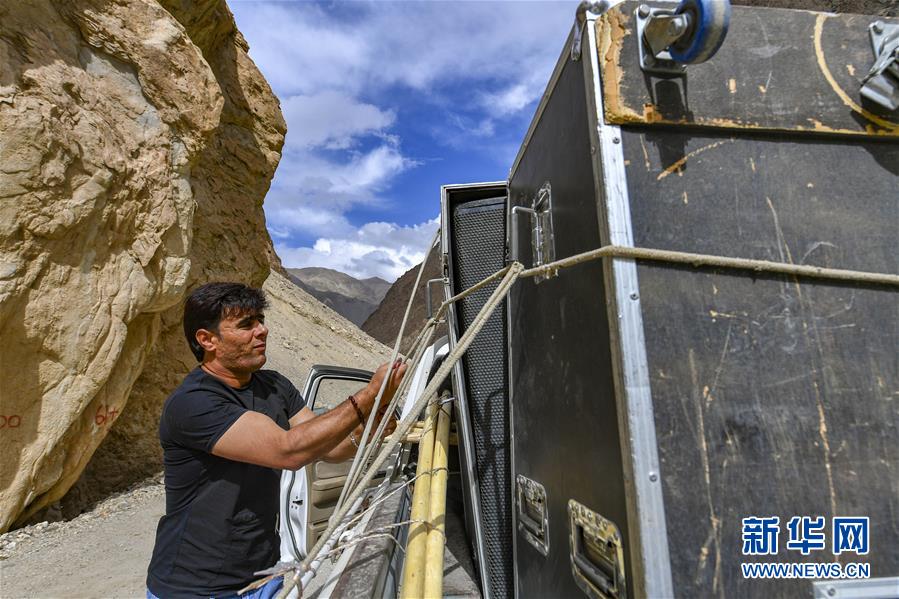 去往達(dá)布達(dá)爾鄉(xiāng)熱斯喀木村途中,塔縣文工團(tuán)演員拜合提亞爾·居馬汗在休息時(shí)加固車上的演出設(shè)備(6月5日攝)。新華社記者胡虎虎攝