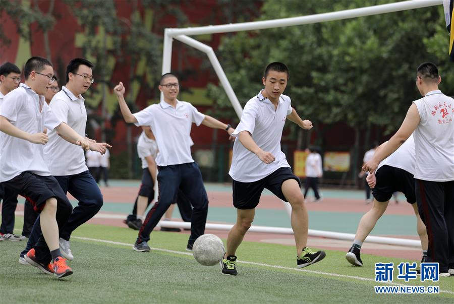 6月9日,河北省衡水市第二中學(xué)的高三學(xué)生在操場上踢足球。2020年高考臨近,河北省衡水市第二中學(xué)組織開展多種形式的集體“減壓”活動(dòng),幫助高三學(xué)生在緊張備考之余釋放身心壓力,以輕松、樂觀、自信的心態(tài)迎接高考。新華社記者朱旭東攝