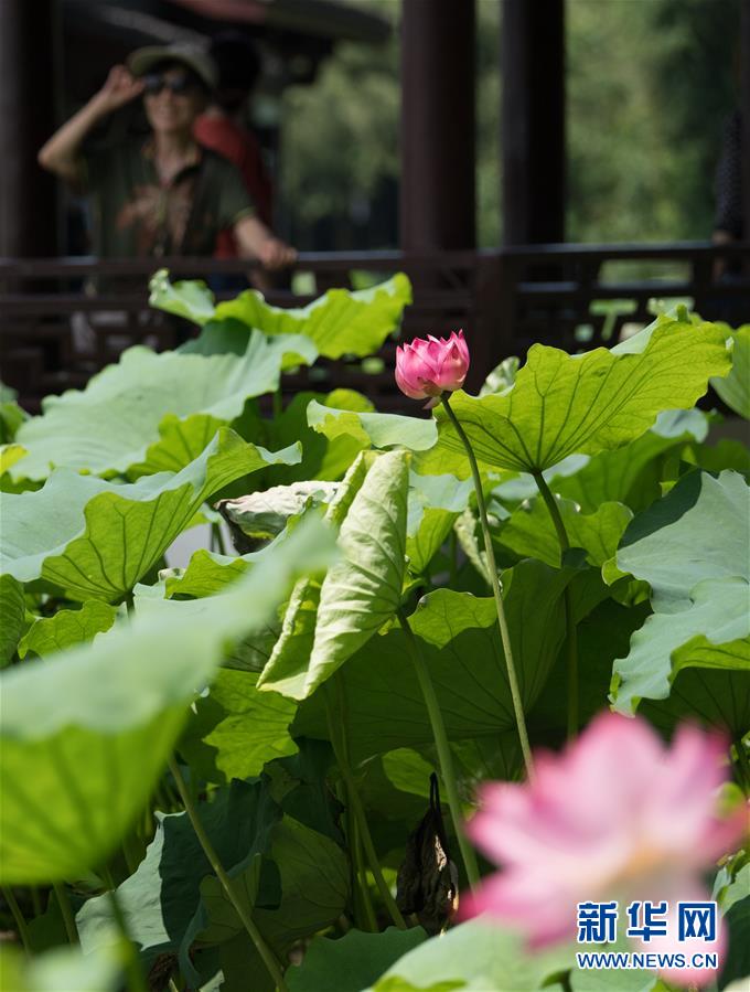 6月12日,游人在西湖曲院風荷留影。隨著氣溫升高,杭州西湖荷花次第開放,引得游人駐足。新華社記者 翁忻旸 攝