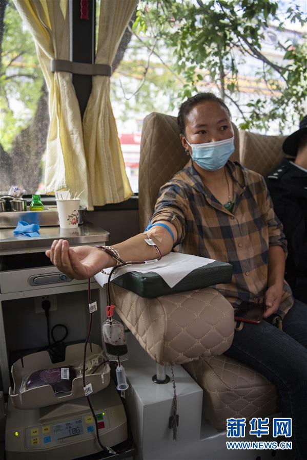 6月14日,在拉薩市宇拓路的獻血點,久美卓瑪在獻血。當日是世界獻血者日。為宣傳無償獻血相關知識、傳播無償獻血公益理念,世界獻血者日宣傳和采血活動在拉薩市舉辦。新華社記者 孫非 攝