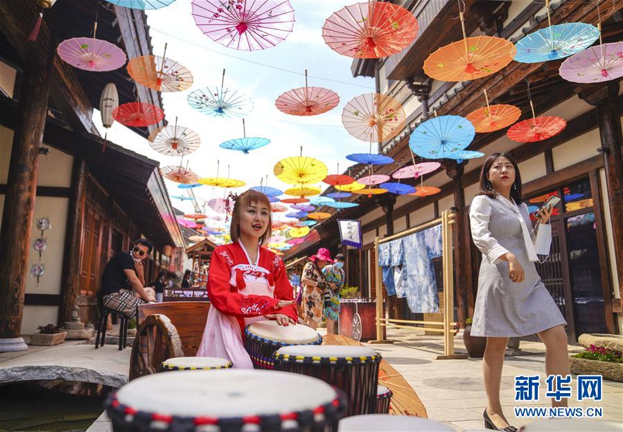 6月13日,在長春市世茂蓮花山小鎮(zhèn)寬厚里商街,表演者身穿漢服、古裝進(jìn)行表演展示。當(dāng)日是“文化和自然遺產(chǎn)日”。吉林長春首屆蓮花山消夏生活節(jié)在世茂蓮花山小鎮(zhèn)舉行?;顒?dòng)將非遺展示與假日消暑休閑相結(jié)合,讓游人在“古色古香”的油紙傘巷中品傳統(tǒng)文化魅力,享夏日休閑愜意。新華社記者 許暢 攝