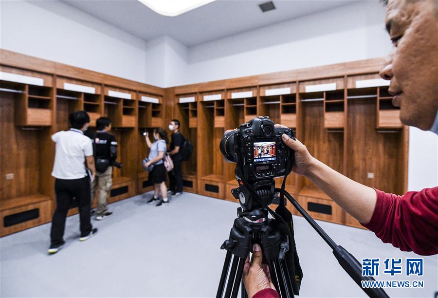 6月16日,在新疆烏魯木齊奧林匹克體育中心綜合體育館內,媒體從業(yè)者在拍攝運動員更衣室。新華社記者 王菲 攝