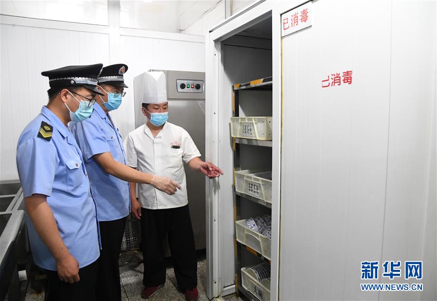 6月17日,在位于北京市海淀區(qū)的海碗居增光路店,執(zhí)法人員對店內(nèi)碗筷的消毒情況進行檢查。新華社記者 任超 攝