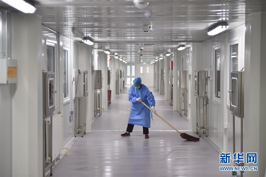 6月19日,在北京地壇醫(yī)院隔離病房外,工作人員在做走廊的清潔。新華社記者彭子洋攝