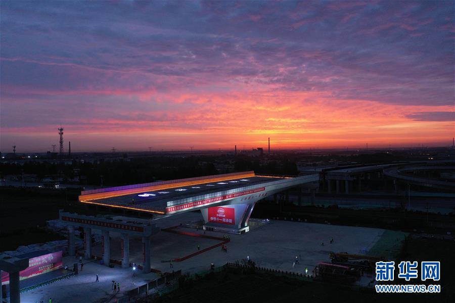 G107河北邢臺(tái)段繞城上跨京廣鐵路轉(zhuǎn)體橋?qū)崿F(xiàn)成功轉(zhuǎn)體(6月16日無(wú)人機(jī)照片)。6月16日凌晨,由中鐵十一局承建的G107河北邢臺(tái)段繞城上跨京廣鐵路轉(zhuǎn)體橋成功完成歷時(shí)60分鐘的空中轉(zhuǎn)體。這座單墩雙肢結(jié)構(gòu)轉(zhuǎn)體橋,轉(zhuǎn)體段長(zhǎng)100米、寬34.5米,梁體總重達(dá)14200噸。新華社記者朱旭東攝