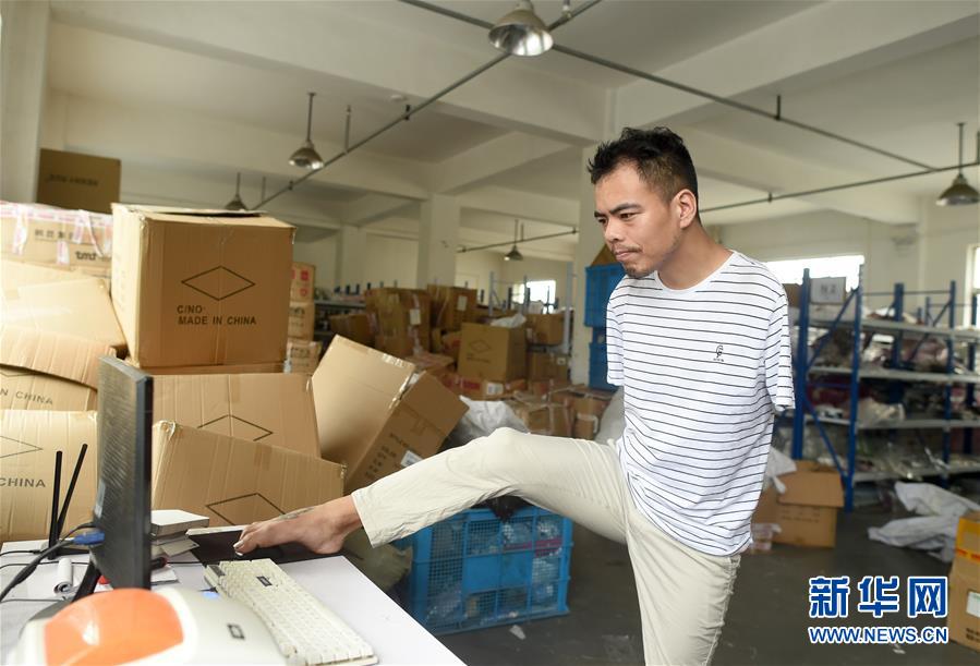 6月12日,金江偉用腳控制鼠標(biāo)打印網(wǎng)店訂單。今年34歲的金江偉是浙江省諸暨市楓橋鎮(zhèn)樂(lè)山村村民。5歲時(shí)的一場(chǎng)意外讓他失去了雙臂,但金江偉沒(méi)有向命運(yùn)屈服。從2016年起,金江偉和弟弟開(kāi)始在電商領(lǐng)域創(chuàng)業(yè),開(kāi)網(wǎng)店銷(xiāo)售襪子,金江偉負(fù)責(zé)網(wǎng)店策劃和客服。經(jīng)過(guò)苦練,他用腳打字的速度已經(jīng)與常人無(wú)異。在他的努力下,這幾年網(wǎng)店年銷(xiāo)售額超過(guò)100萬(wàn)元。新華社記者韓傳號(hào)攝