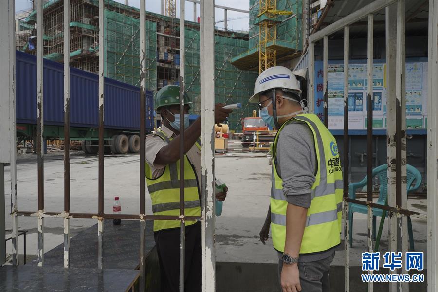 6月21日,在斯里蘭卡首都科倫坡,一名工人在中國港灣科倫坡房建項(xiàng)目工地門口接受體溫檢測。新華社記者唐璐攝