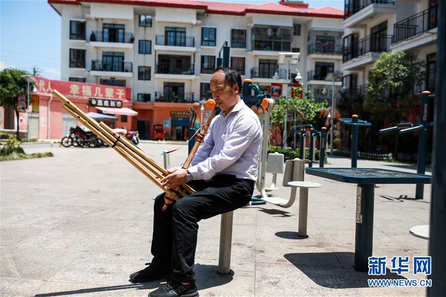 在貴州省惠水縣明田街道易地扶貧搬遷項(xiàng)目新民社區(qū),居民羅應(yīng)和在新居旁吹蘆笙(5月6日攝)。新華社記者歐東衢攝