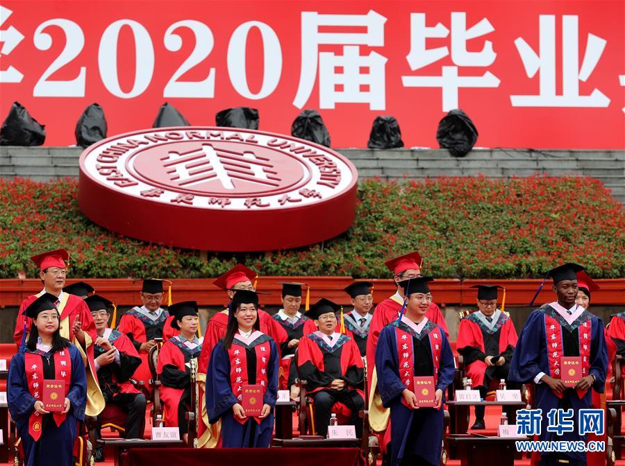 6月23日,在華東師范大學(xué)閔行校區(qū)的畢業(yè)典禮上,優(yōu)秀畢業(yè)生代表接受表彰。當(dāng)日,華東師范大學(xué)舉行2020屆畢業(yè)典禮。由于疫情防控需要,今年的典禮在兩個(gè)校區(qū)分別舉辦,并全程在線直播。約7700名華東師范大學(xué)2020屆畢業(yè)生通過現(xiàn)場(chǎng)或“云端”的方式參加畢業(yè)典禮。新華社記者劉穎攝