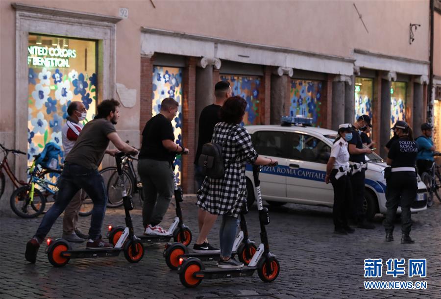 6月23日,在意大利首都羅馬,人們騎著電動踏板車在城市中穿行。新華社記者程婷婷攝