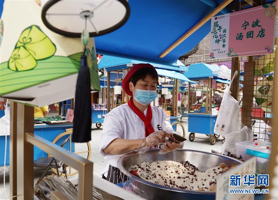6月24日,在上海豫園舉辦的端午花神國風(fēng)廟會(huì)上,老字號(hào)寧波湯團(tuán)店的師傅在包制傳統(tǒng)的“枕頭粽”。端午節(jié)臨近,各地舉行包粽子、做香包、賽龍舟等豐富多彩的民俗文化活動(dòng),迎接傳統(tǒng)佳節(jié)的到來。新華社記者劉穎攝