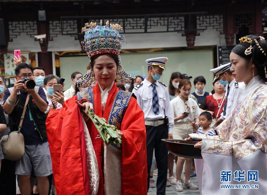 6月24日,在上海豫園舉辦的端午花神國風(fēng)廟會(huì)上,身著古裝的演員在表演。端午節(jié)臨近,各地舉行包粽子、做香包、賽龍舟等豐富多彩的民俗文化活動(dòng),迎接傳統(tǒng)佳節(jié)的到來。新華社記者劉穎攝