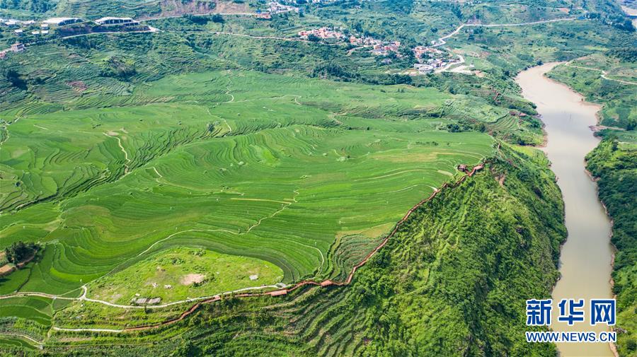 貴州省盤州市新民鎮(zhèn)的梯田風光(6月29日攝,無人機照片)。夏日時節(jié),貴州省盤州市新民鎮(zhèn)的梯田風景如畫。新華社記者陶亮攝