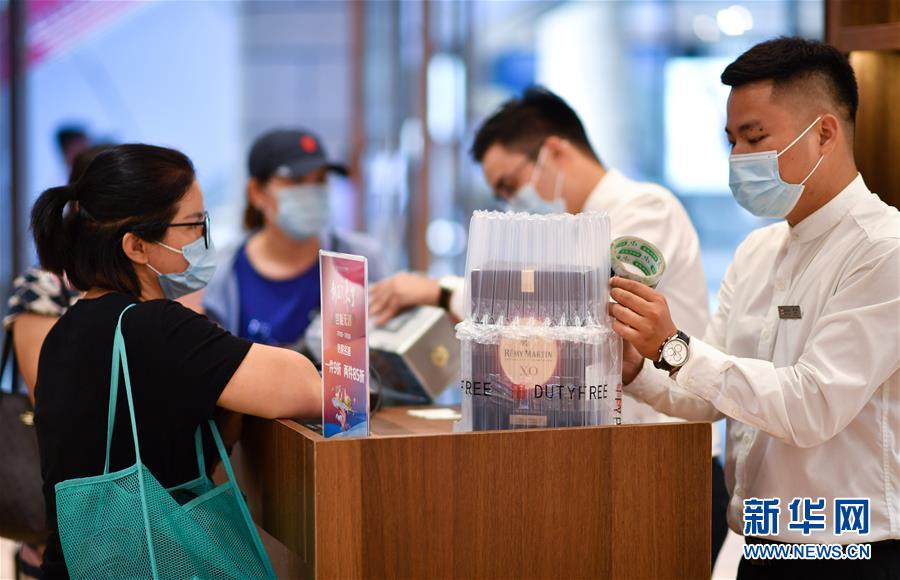 7月1日,??谌赵聫V場免稅店的工作人員為顧客打包酒類商品。當日,海南開始實施調整后的離島免稅購物政策。海南離島旅客每年每人免稅購物額度提高至10萬元,電子消費產品等7類新增商品開售。新華社記者郭程攝