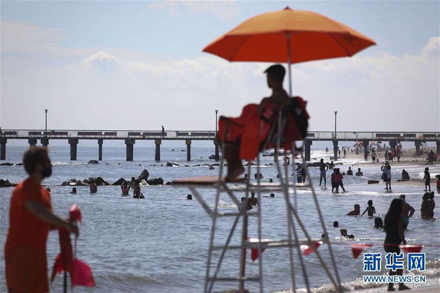 7月1日,人們在美國紐約科尼島戲水。當(dāng)日,美國紐約市屬八處海灘正式重新準(zhǔn)許民眾游泳,救生員也同時上崗。新華社記者王迎攝