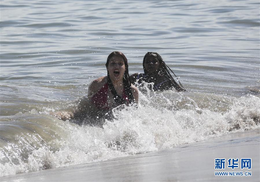 7月1日,人們?cè)诿绹?guó)紐約科尼島戲水。當(dāng)日,美國(guó)紐約市屬八處海灘正式重新準(zhǔn)許民眾游泳,救生員也同時(shí)上崗。新華社記者王迎攝